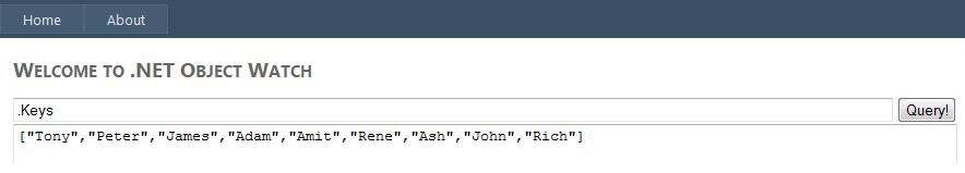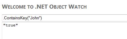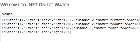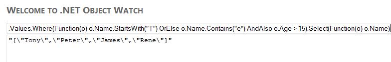 This is an experimental implementation of a Watch to evaluate .NET objects in Runtime using VB.NET. One of the key feature of this object watch is that you can even evaluate Lambda Expressions which is not supported in the current(2012) or previous versions of visual studio. That said, most of these features are still at its infancy. Currently the watch supports member access using properties including indexer properties, method invocations and also supports LINQ Expressions. The result are serialized to JSON with the help of Newtonsoft’s JSON.NET