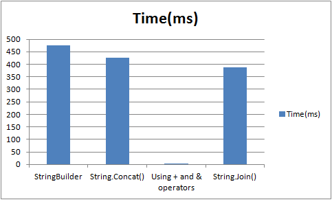 Now the results are totally different. String.Join() seems to perform the best. But having an empty delimiter sounds an unfit and a bit confusing. Concatenation using (+ or &) is now showing its real colour, it is performing slower than String.Join() and String.Concat().
